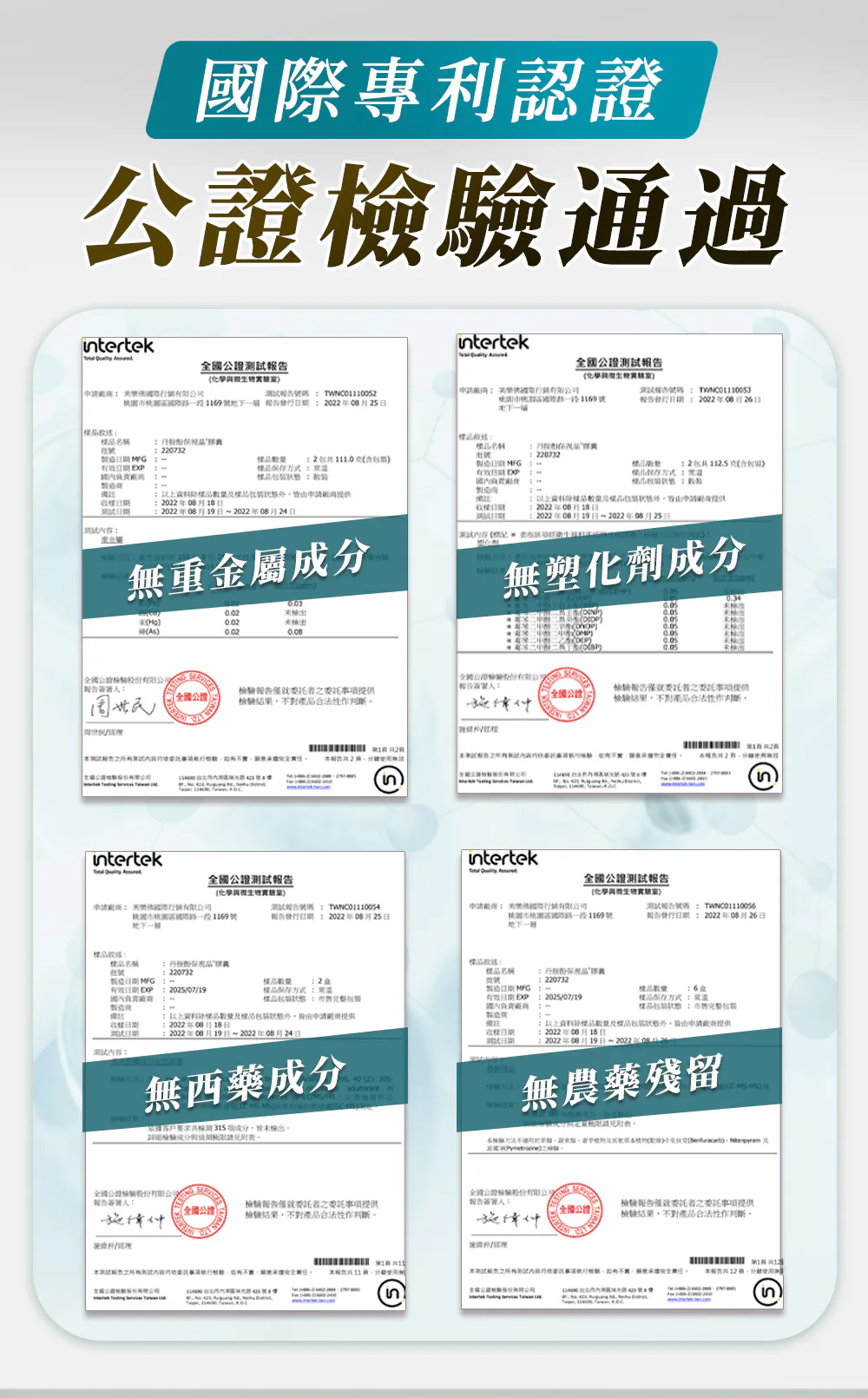 成份:專利丹參萃取物(丹參萃取物、麥芽糊精)、造粒微結晶狀α-纖維素(微結晶狀α-纖維素、麥芽糊精)、紅藻萃取物、丹參萃取物(丹參萃取物、麥芽糊精)、魚腥草萃取物(魚腥草萃取物、玉米糊精)、流行鏈球菌發酵物(含透明質酸鈉)、葡萄皮萃取物(葡萄皮萃取物、β-環狀糊精、麥芽糊精)、番紅花萃取物(微結晶狀α-纖維素、番紅花萃取物)、硬脂酸鎂、二氧化矽、黑大豆皮萃取物、流行鏈球菌發酵物(含透明質酸鈉)、魚腥草萃取物、紅藻萃取物[辛烯基丁二酸鈉澱粉、紅藻萃取物、L-抗壞血酸棕櫚酸酯、生育醇(維生素E)]、枸杞萃取物(枸杞萃取物、麥芽糊精)、維生素A[乾燥葡萄糖漿、阿拉伯膠、玉米澱粉、維生素A、生育醇(維生素E)(抗氧化劑)]