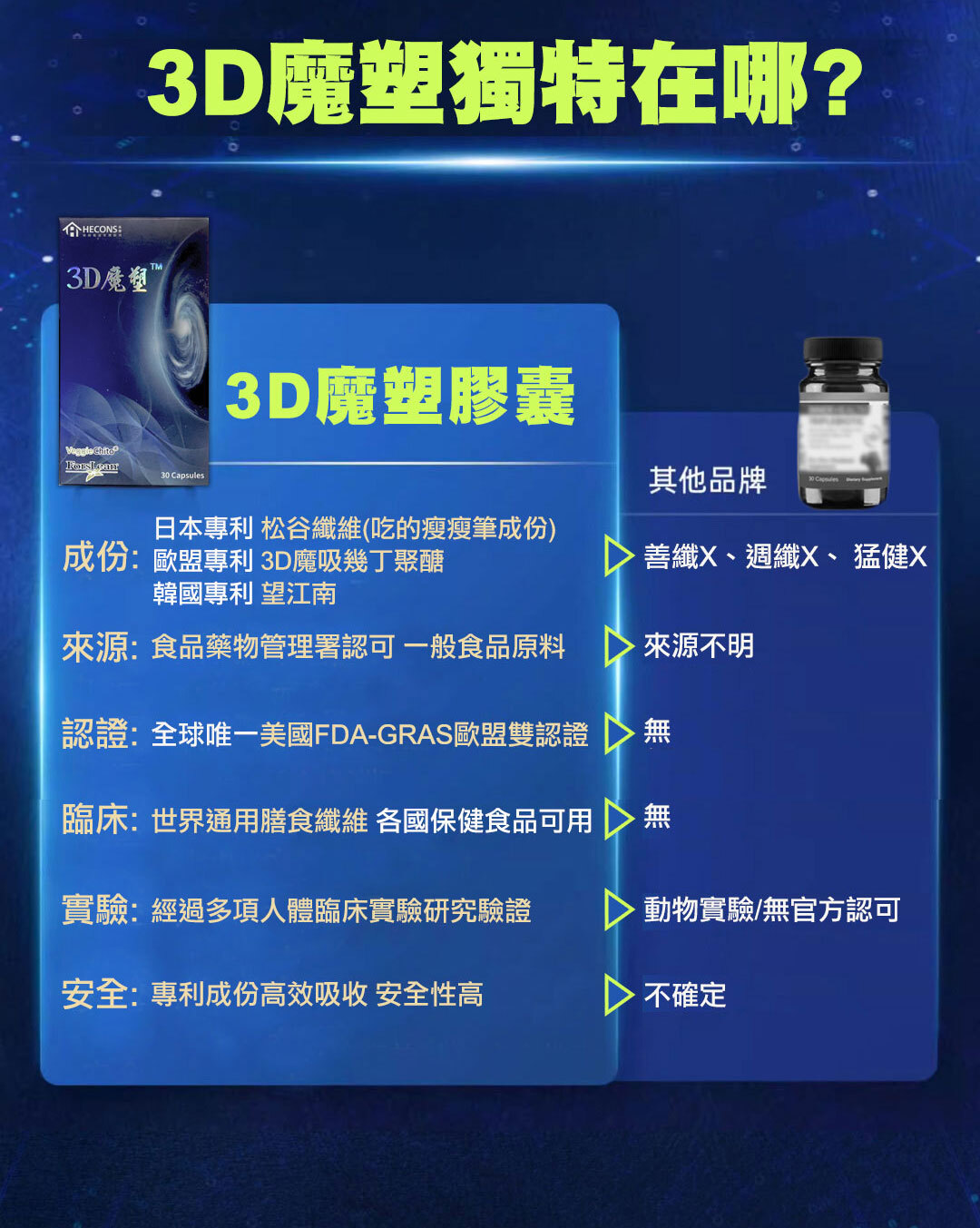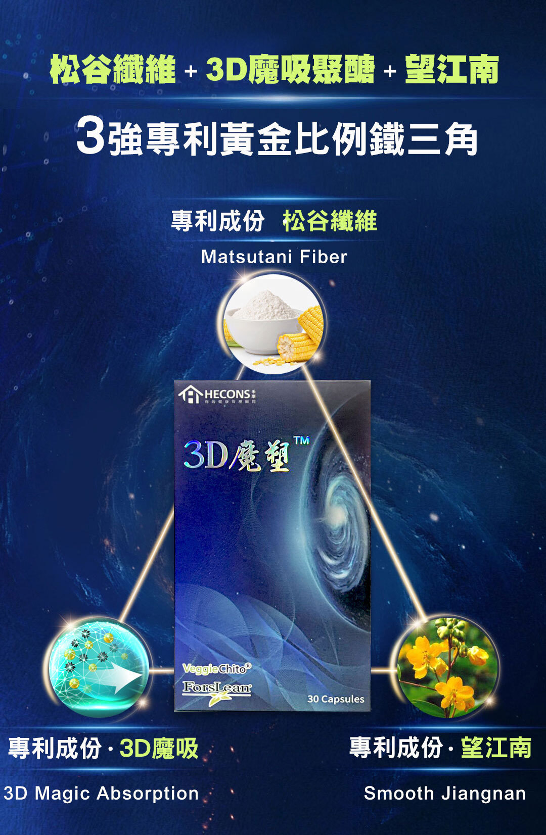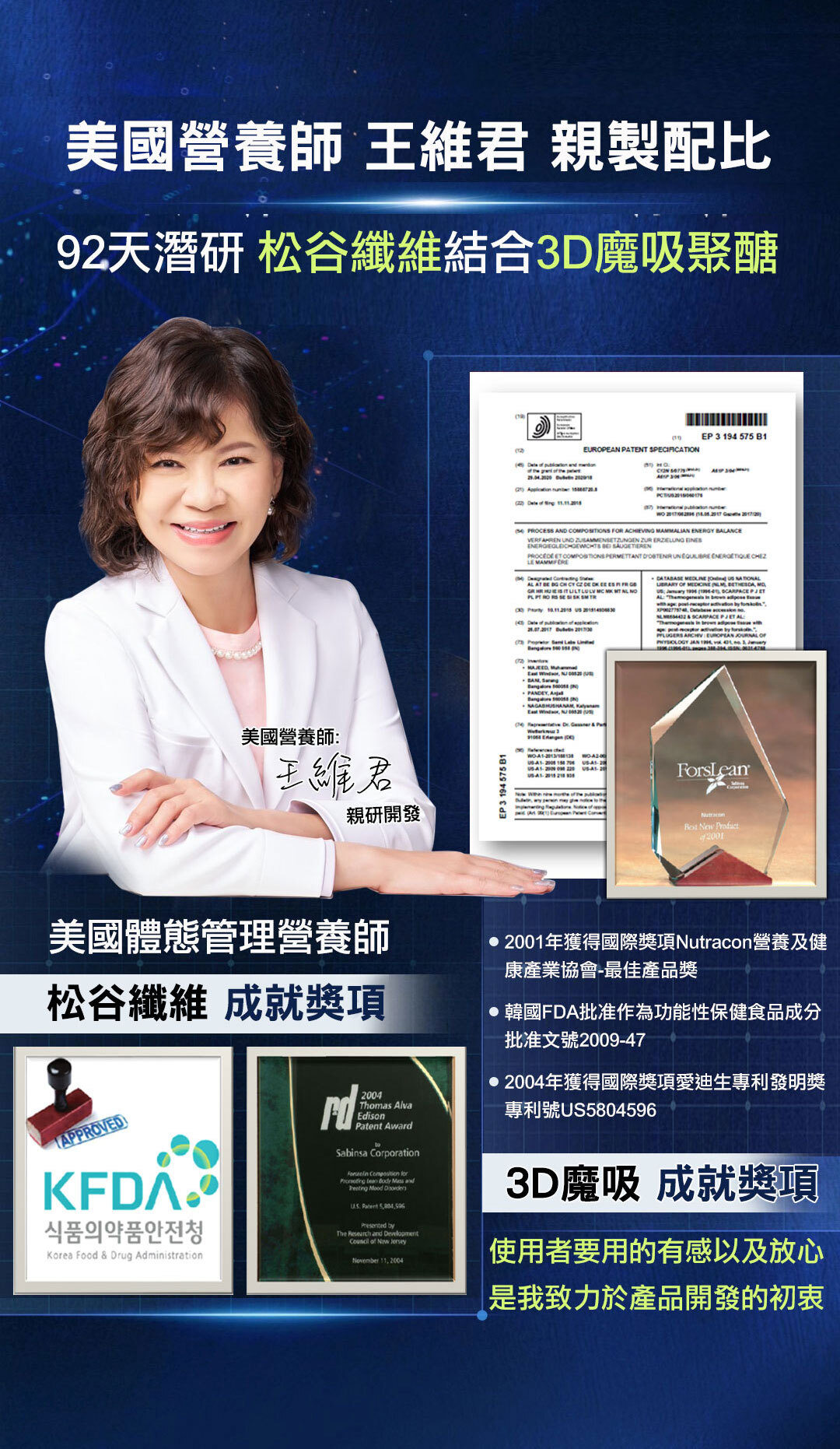 成 份:幾丁聚糖(由黑麴菌絲體(Aspergillusniger mycelium)所製取)、專利毛喉翹蕊花萃取物(麥芽糊精、毛喉鞘蕊花萃取物)、難消化性麥芽糊精(玉米來源可溶性纖維)、望江南萃取物