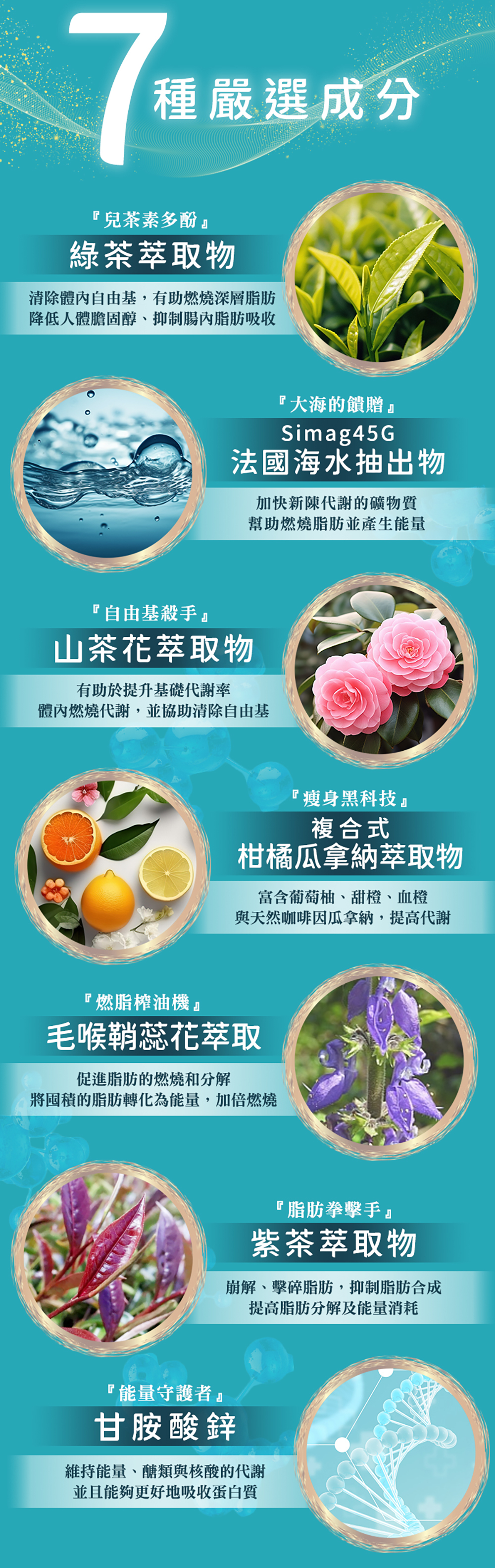 成份 :複合式柑橘及瓜拿納萃取物(複合式柑橘〔葡萄柚萃取物、甜橙萃取物、血橙萃取物〕、麥芽糊精、瓜拿納萃取物)、毛喉鞘蕊花萃取物(毛喉鞘蕊花萃取物、麥芽糊精)、專利 C3 薑黃萃取物、日本專利洋蔥萃取物、山茶花萃取物、山茶(紫茶)萃取物、綠茶萃取物、專利天堂椒、海水濃縮物、甘胺酸鋅、專利黑胡椒萃取物。
