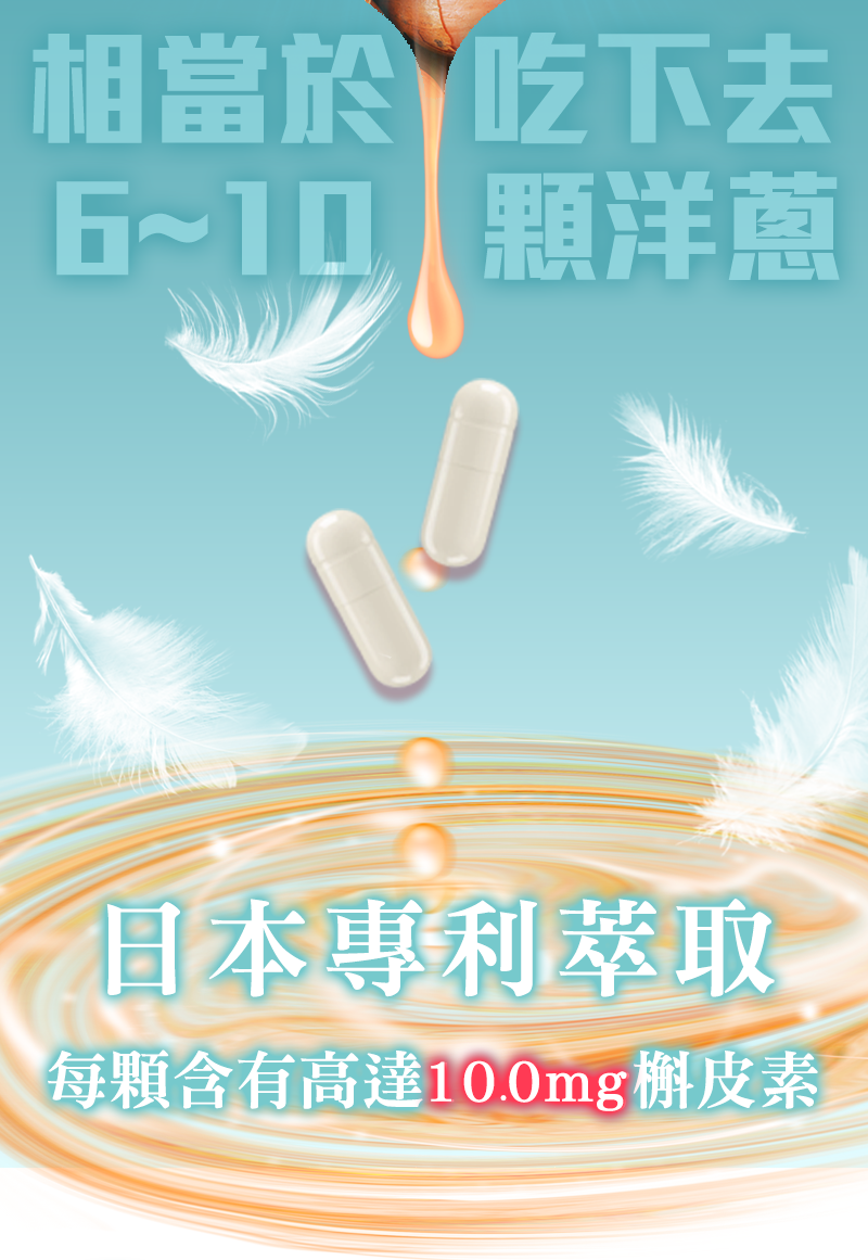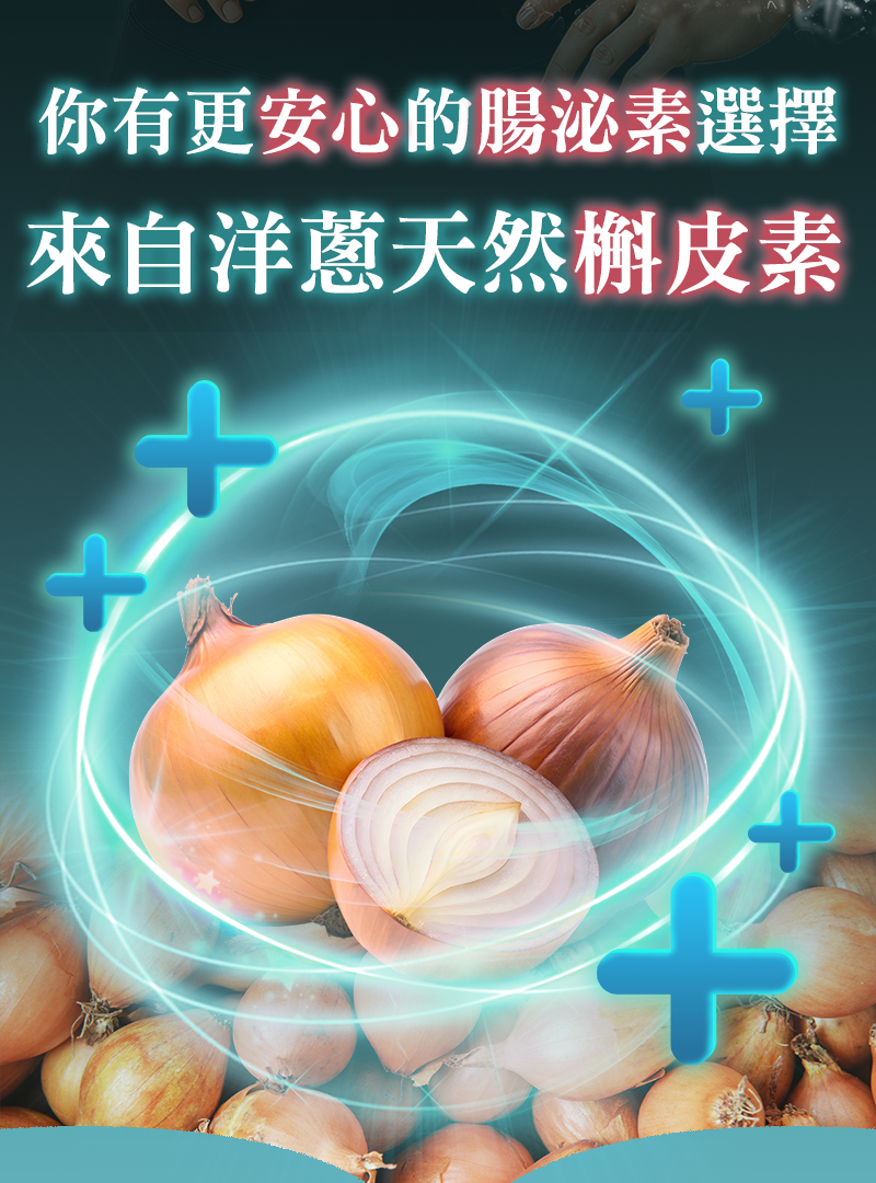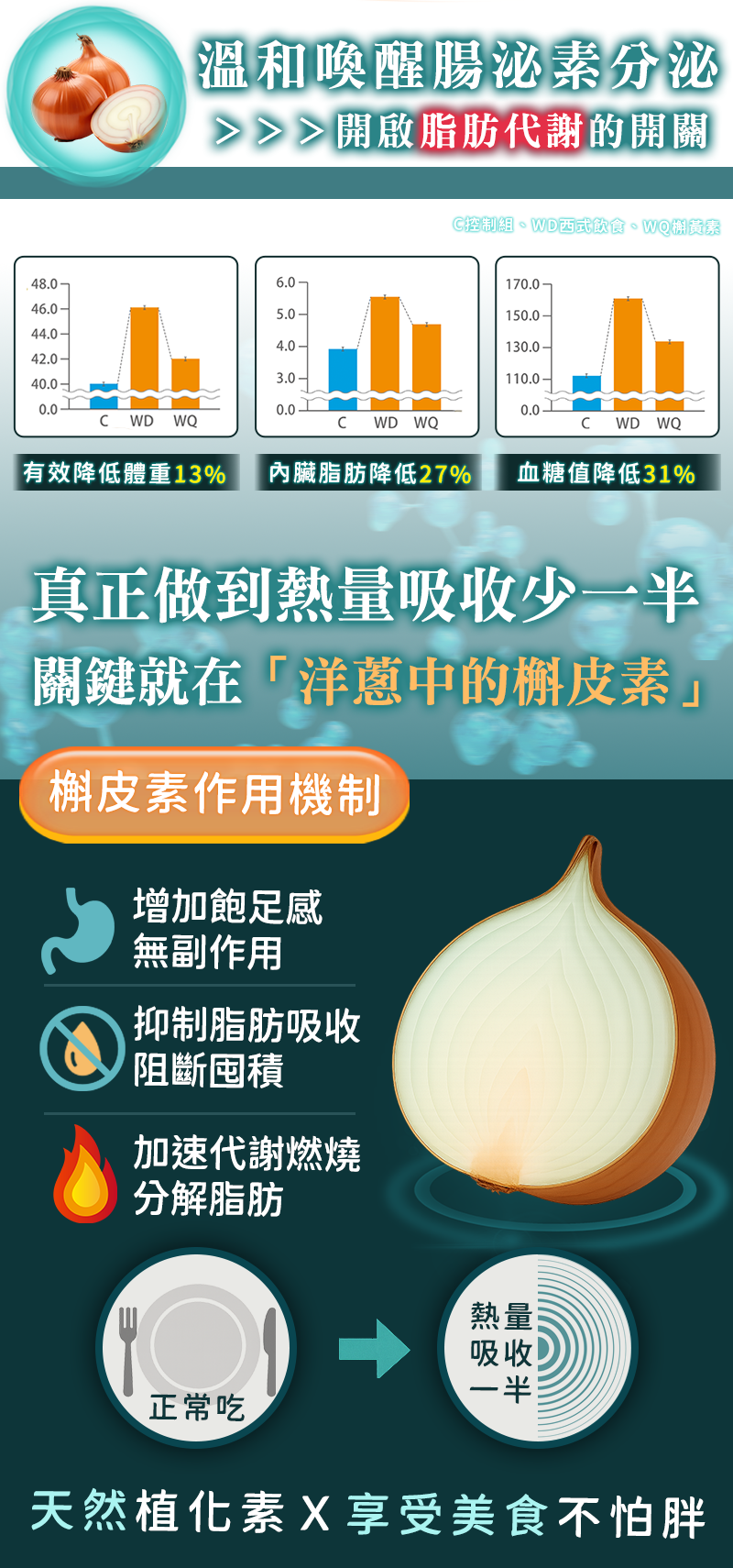 「輕儀伴」用天然方式達到相同機制,每顆含日本專利洋蔥萃取槲皮素100mg,相當6~10顆洋蔥,有效促進GLP-1分泌、提升代謝,熱量吸收直接砍半!