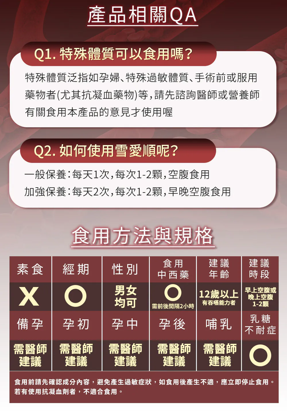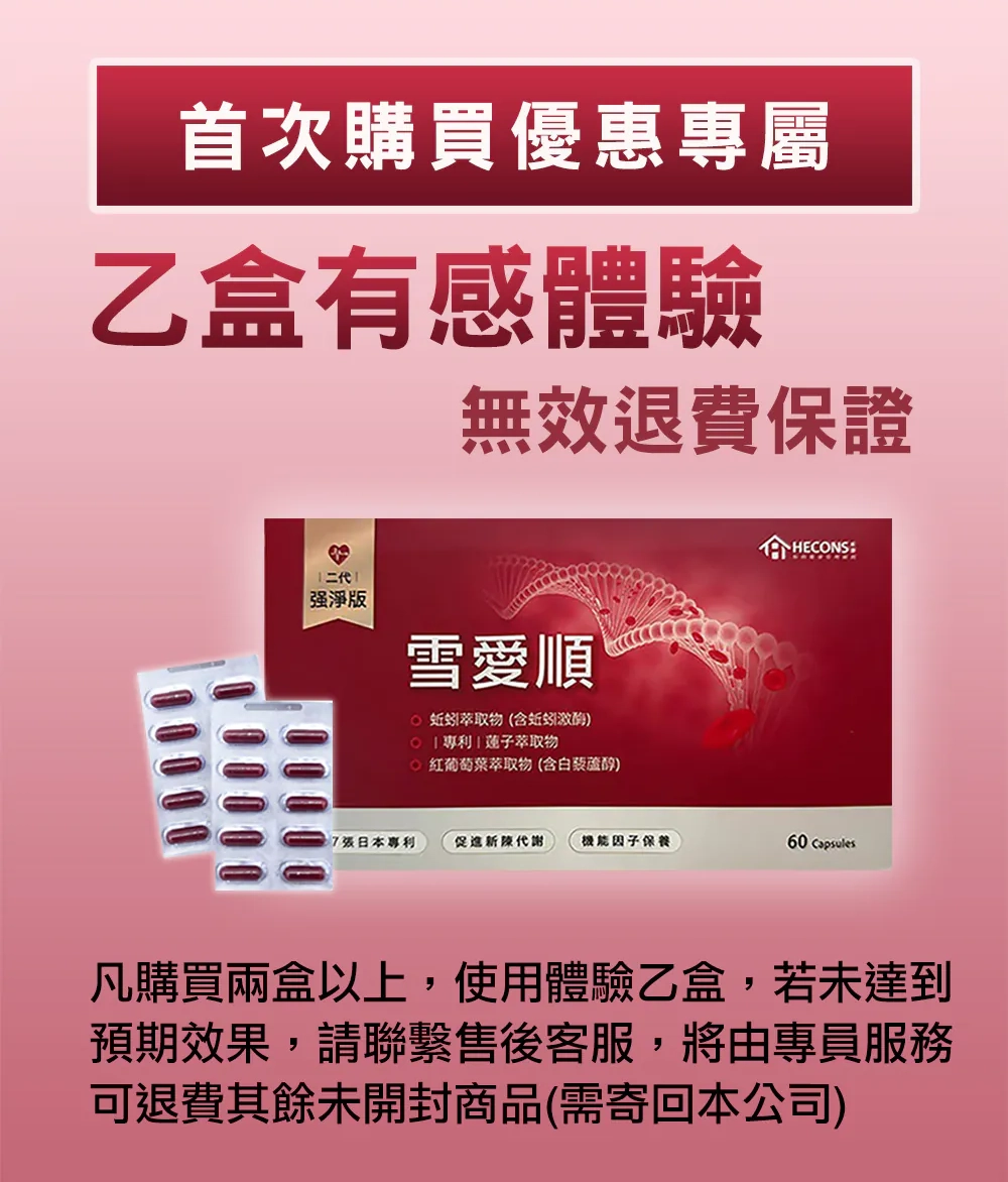 成 分:芹菜萃取物、納豆萃取物、鳳梨萃取物(含鳳梨酵素)、荷葉萃取物、藍莓萃取物(含紫檀芪)、紅葡萄葉萃取物(含白藜蘆醇)、專利蓮子萃取物、蚯蚓萃取物(含蚯蚓激酶)
