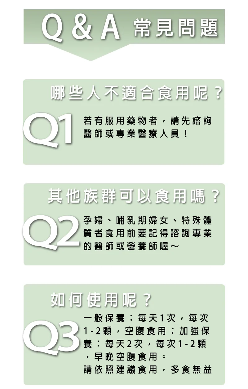 2.孕婦、哺乳期婦女、特殊體質者或服用藥物者 (尤其抗凝血藥物) 請先諮詢師或專業醫療人員。